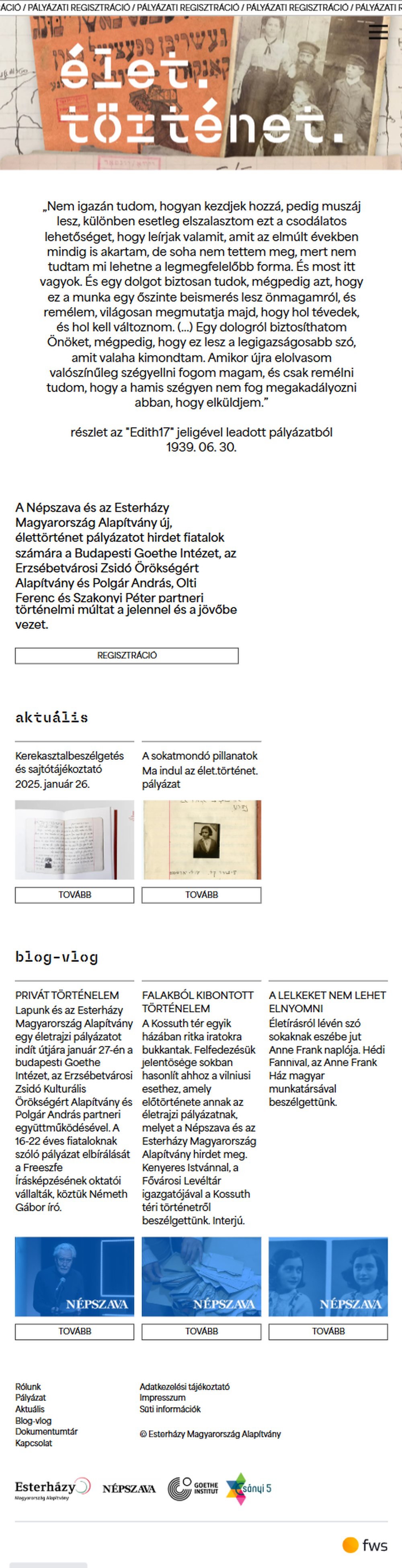 Az Esterházy Magyarország Alapítvány a Népszava, a Budapesti Goethe Intézet, az Erzsébetvárosi Zsidó Örökségért Alapítvány, valamint Polgár András, Olti Ferenc és Szakonyi Péter együttműködésével egy különleges pályázatot hirdetett 16-22 éves fiatalok számára. Az élettörténet-pályázat célja, hogy a benyújtott írások révén feltáruljanak a mai fiatal generáció álmai, félelmei és tapasztalatai, valamint hidat építsenek a múlt, a jelen és a jövő között.