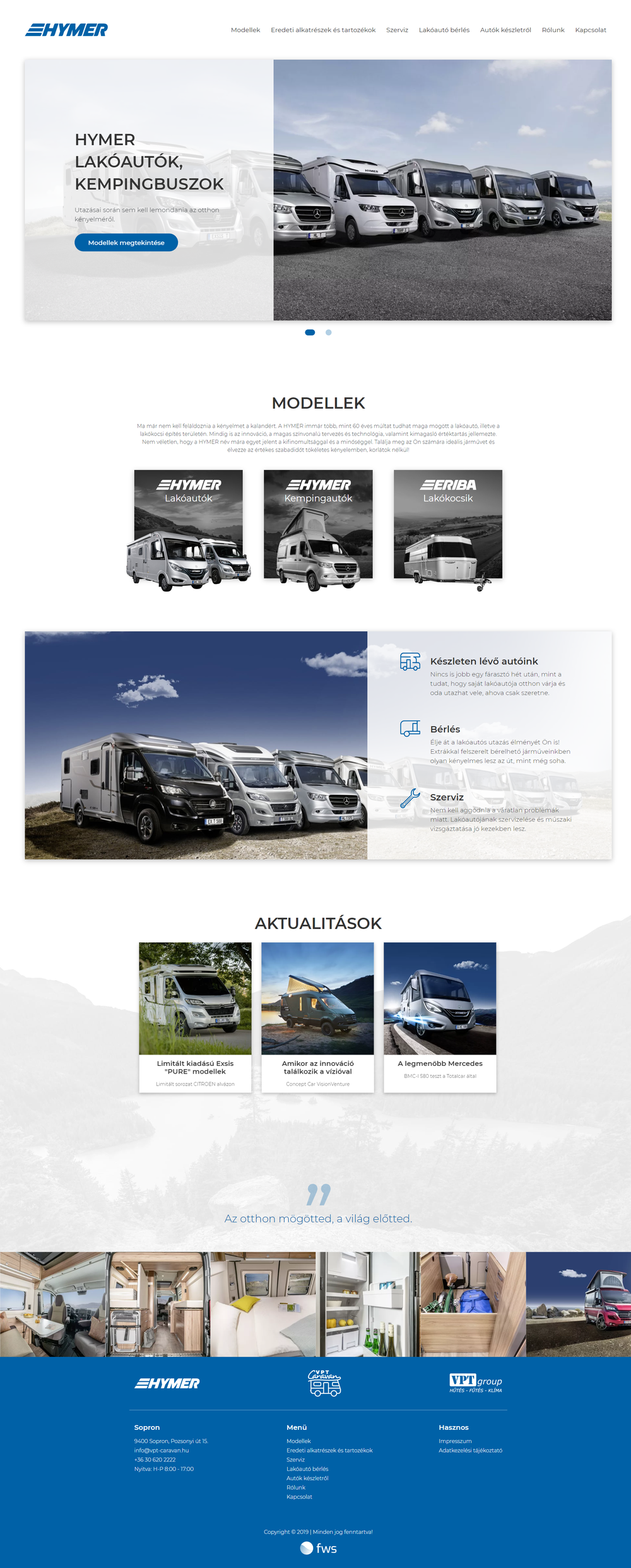 A HYMER Magyarország új honlapjával egyértelmű cél volt, hogy német gyártó modelljeit olyan megjelenésben mutassák be, amely képviseli a prémium lakóuatók státuszát és presztízsét. A weboldalon az érdeklődők egyedi bemutatóoldalakon tekinthetik meg a különböző modelleket. Az itt található képek, videók és adatok kezelése könnyedén kivitelezhető az admin felületről. Nagyon fontos szempont, hogy a weboldalt meglátogató célcsoportot megfogják a szövegek, ezért a nyitóoldal szövegeinek megírásában is támogattuk ügyfelünket.