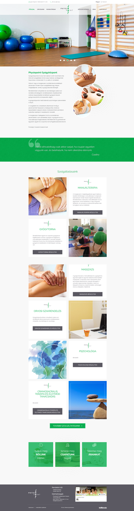 A soproni Physiopoint új weboldalának elkészítésekor a cél egy modern, letisztult, dinamikus weboldal létrehozása volt. Az oldal szolgáltatásai, tartalmi elemei, információi az adminisztrátor jogkörével bármikor fejlesztői segítség igénybevétele nélkül módosítható. Az oldalon az orvosok és munkatársak egyaránt bemutatásra kerülnek. A saját fotók nagyban hozzájárulnak az oldal egyedi megjelenéséhez.