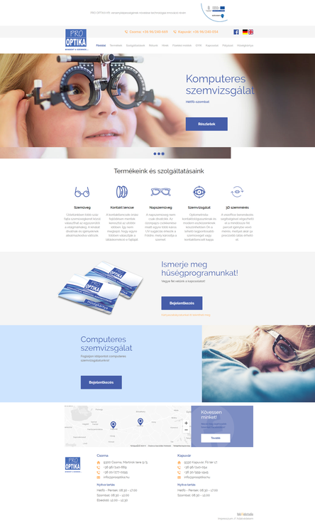 A Pro Optika a 90-es években kezdte meg működését Kapuváron, majd egy Csornai üzlettel bővült a vállalkozás. A rábaközben elismert cég meglévő honlapjával sok probléma merült fel, frissítése bonyolult volt, minden módosításhoz szakemberre volt szükség. Új weboldaluk elkészítése során fontos volt, hogy látogatóikat megfelelően tájékoztathassák akcióikról és legfrissebb híreikről. Az üzlet múltjára való tekintettel elegáns és letisztult honlapot hoztunk létre. Mindkét bolt elérhetőségét külön kezelheti az adminisztrátor, ezen felül a látogatók a kiválasztott üzletben a kiemelt szolgáltatásokra időpontot is foglalhatnak. A weboldal a jelenlegi elvárásoknak megfelelően természetesen mobil eszközökre is optimalizált.