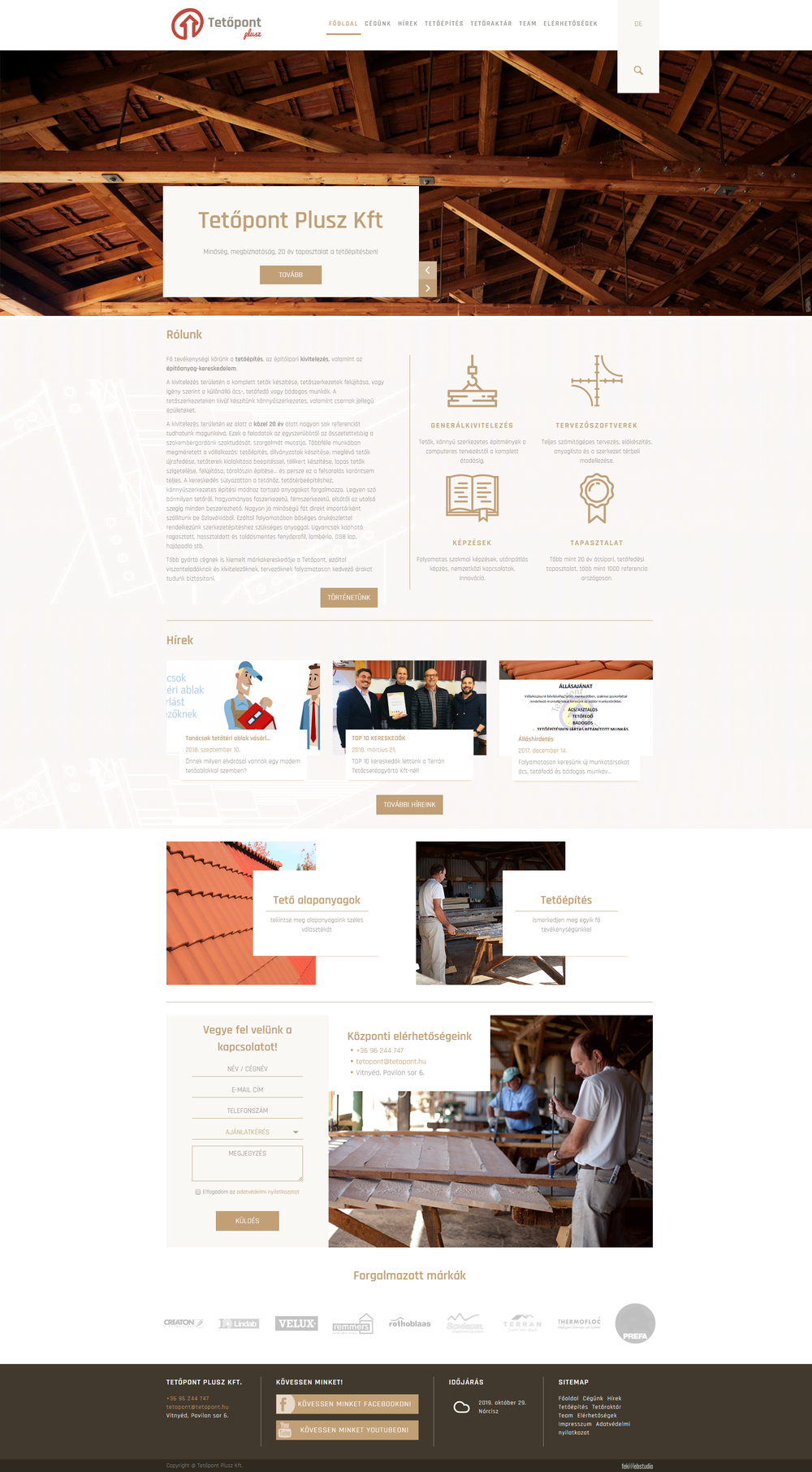 A Tetőpont Plusz Kft. közel 20 év tapasztalattal rendelkezik a tetőépítéssel kapcsolatos megoldásokban. Ügyfeleik számára mindig a legjobbat nyújtják, ezáltal a cég múltjához méltó egyedi, kifinomult weboldal létrehozását tűzték ki célként. A honlapon a látogató megismerheti a cég teljes történetét egy egyedi hírfolyam stukrútában megjelenítve, tájékozódhat arról, hogy miként zajlik a profi tetőépítés és megtekintheti a minődégi alapanyagokat az oldal tetőraktár felületén. A naprakész híreket az adminisztrátor tölti fel. A honlap reszponzív verzióját is kialakítottuk, így a mobil eszközökről is gyors és pontos elérést biztosítottunk a felhasználók számára. Megrendelők az adminisztrációs felületen elérhető statisztika modulból naprakész információt kap a látogatói szokásokról.